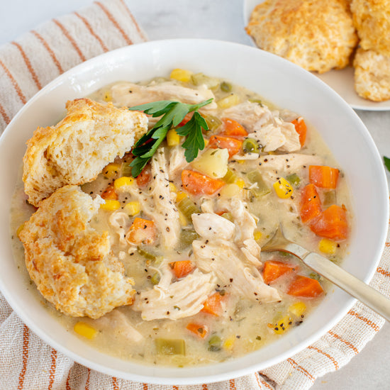Once soup is done cooking, shred chicken and thicken soup as directed, and transfer soup to an oven safe dish. Spread biscuit dough (about 8 biscuits) on top of the soup. Place the dish in the oven and bake at 425° for 18-20 minutes or until the biscuits are golden brown and cooked through.